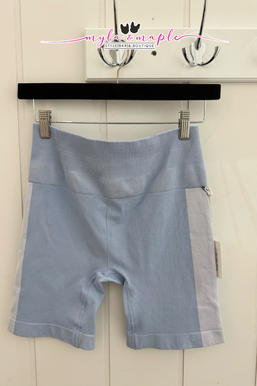 Side contrast biker shorts in baby blue with a light blue side stripe!