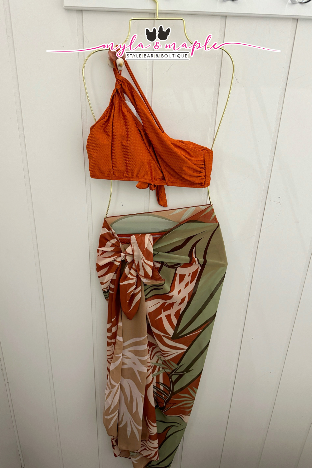 This two-piece one-shoulder bikini set comes with a leaves printed cover up skirt. Beautiful coffee color sure to bring at that tan this summer! This set is so sheik!