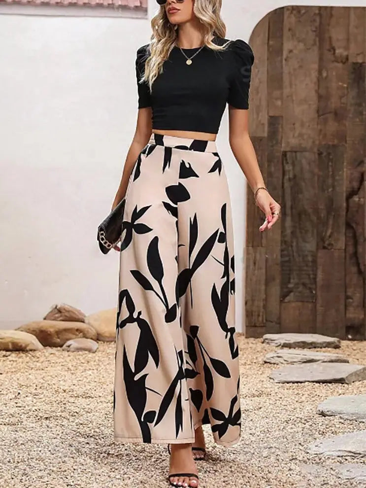 Skinny Crop Top Leaf Wide Leg Pants Set Color Black