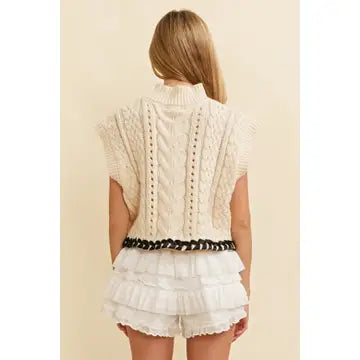 Cable Knit Drop Shoulder Contrast Stitch Sweater Cream trimmed in Black