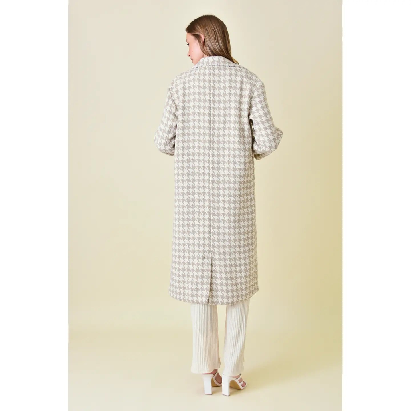 Elegant long sleeve houndstooth long coat Beige/Ivory color