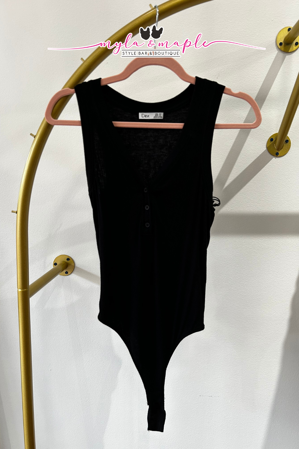 This black tank top bodysuit features ribbed detailing for added style and comfort.