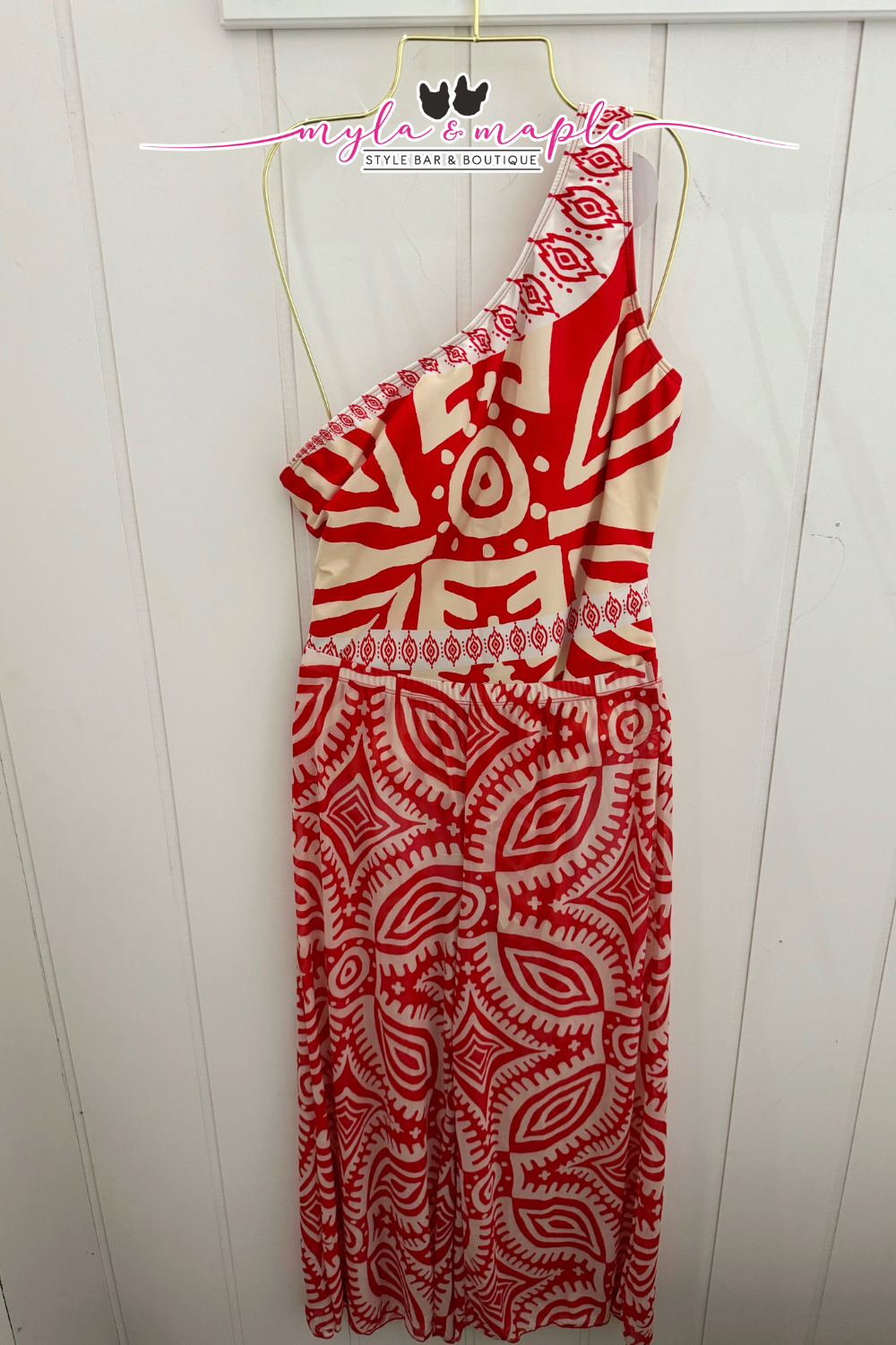Sophisticated swim set featuring a red & cream patterned one shoulder bikini with matching cover-up pants.