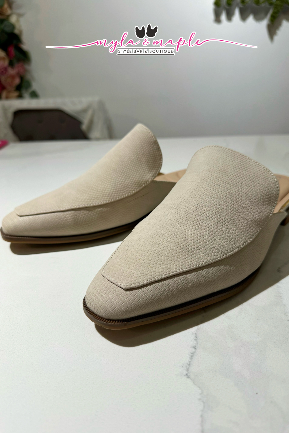 Soft beige mule shoes. These pair perfectly with work attire and will keep you comfy all day long!