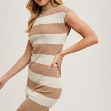 Striped Mock Neck Cap Sleeved Bodycon Mini Dress Taupe Stripe
