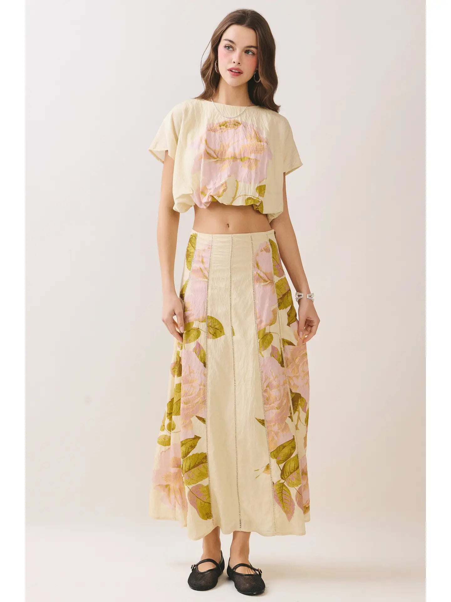 Floral Print Relaxed Silhouette A-Line Maxi Skirt and Top Yellow