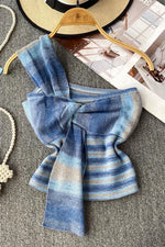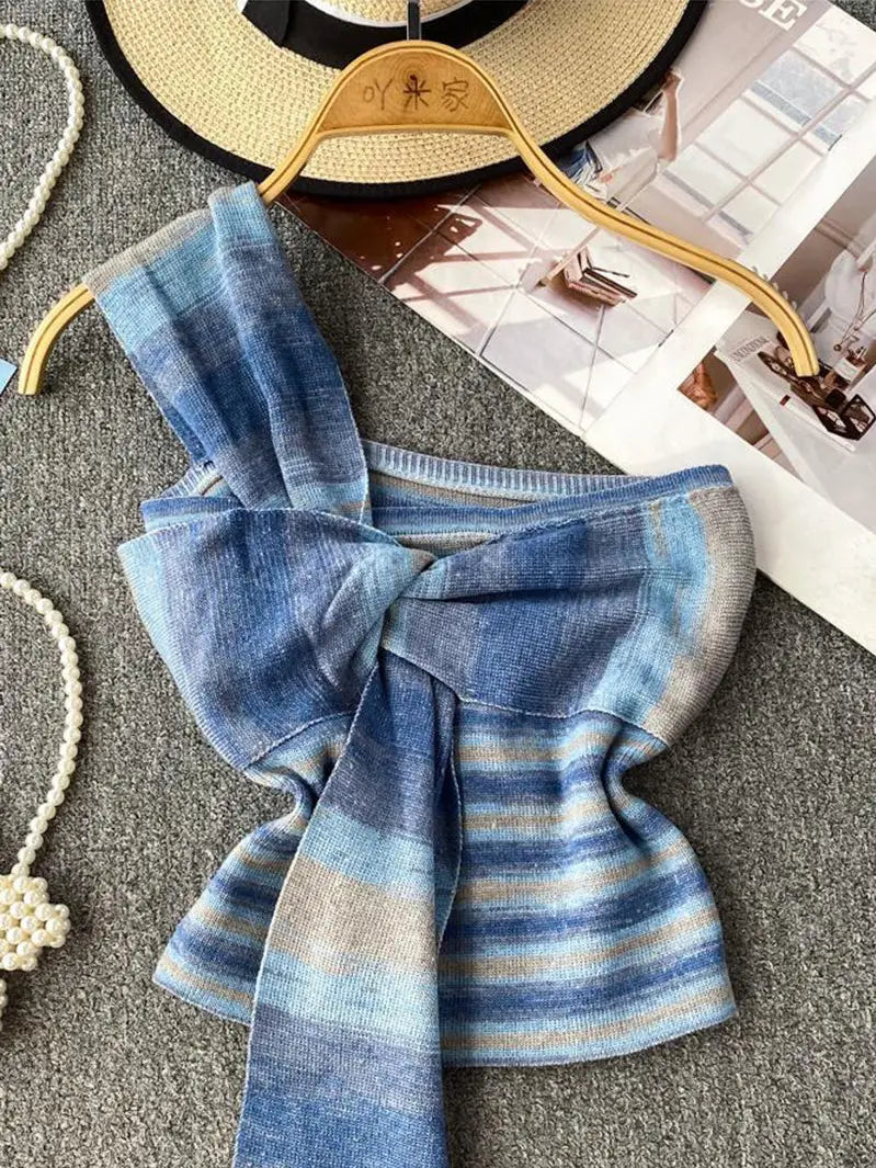Striped tank top with bow and one shoulder strap color is blue with beige