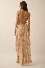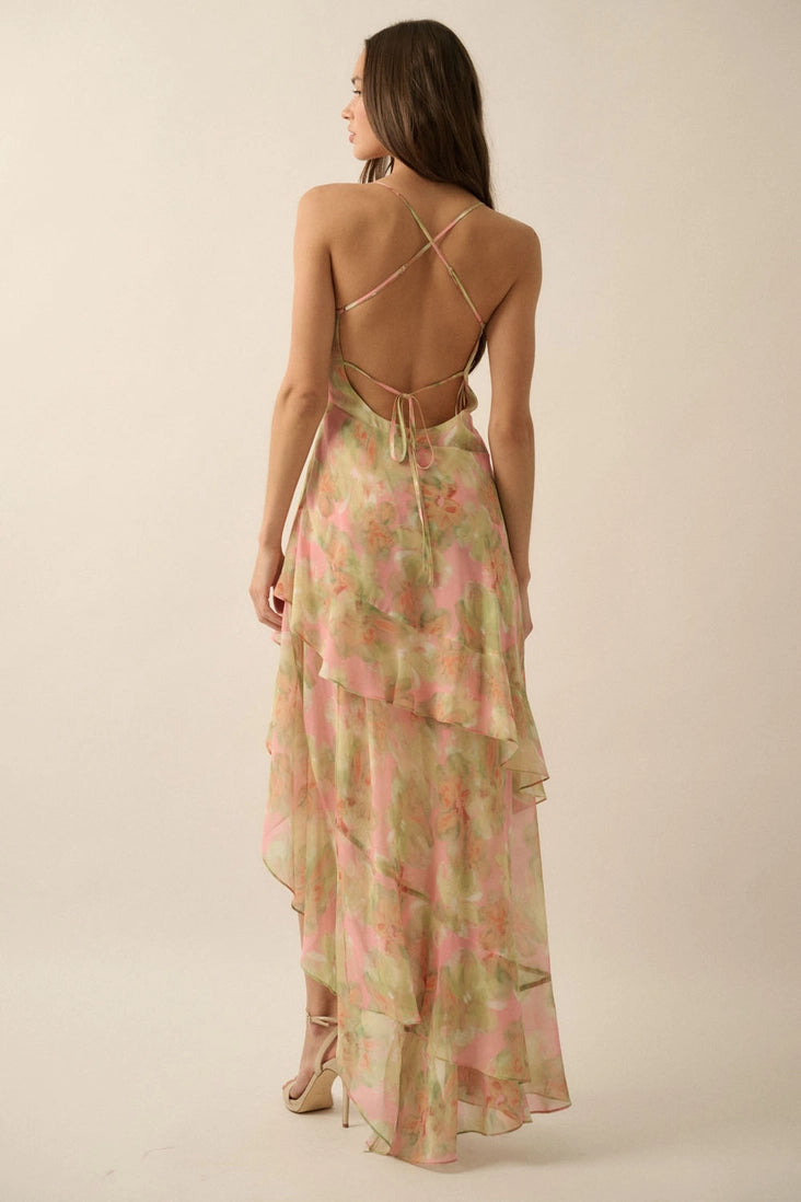 Floral Chiffon Asymmetrical Ruffle Maxi Dress, Cowl Neckline, with Adjustable Straps in Pink