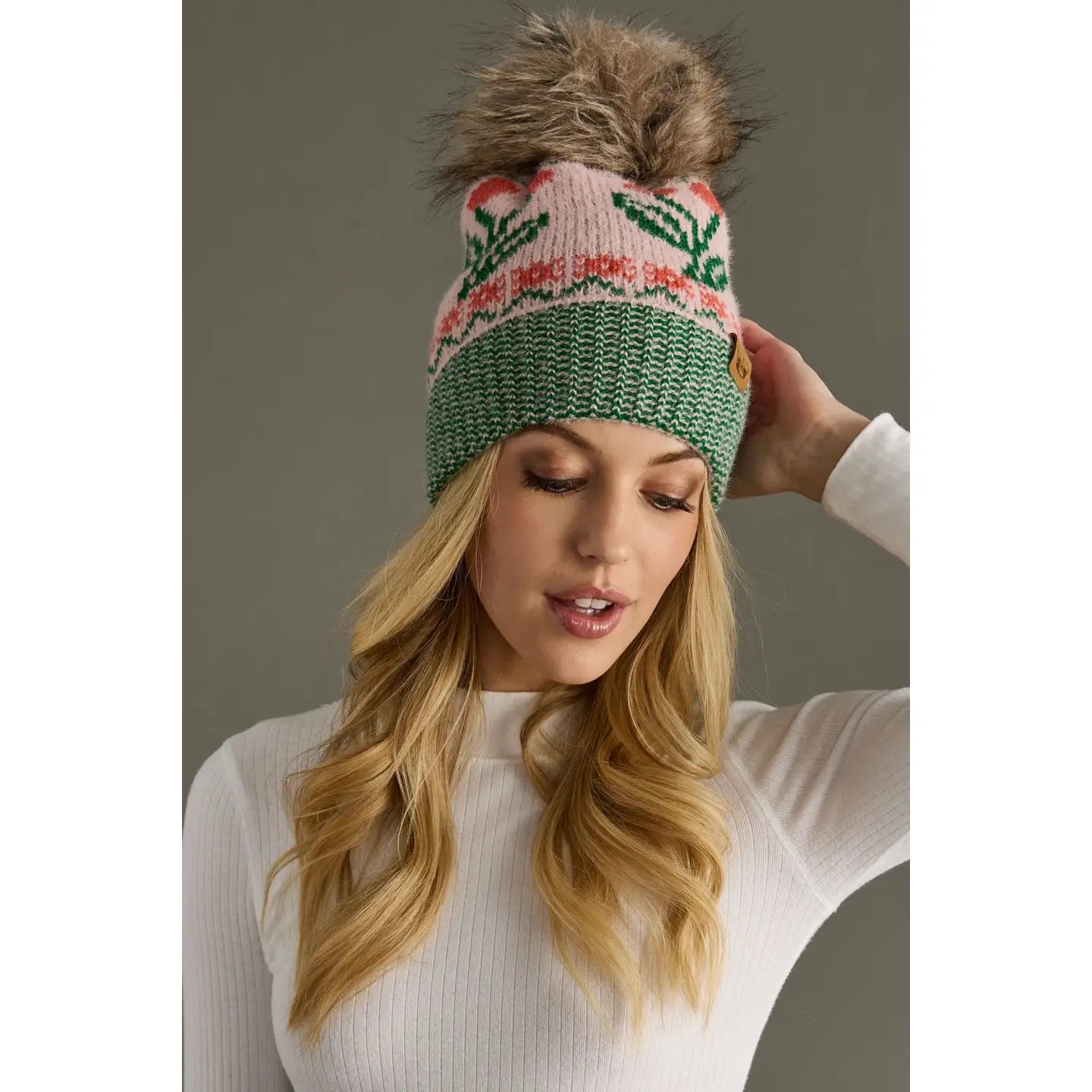 Lt. Pink Cherry Pattern Pom Hat