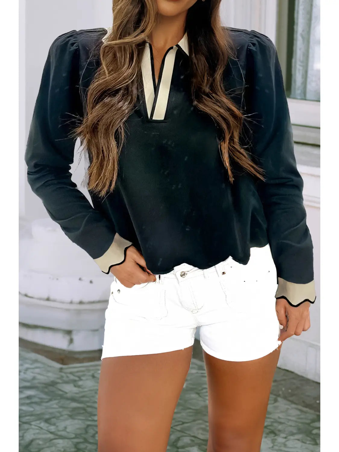 Scallop Trim Collar Black Long Sleeve Collared Top