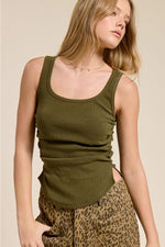 Tank Top with Ribbed Knit Fabric and Ruching on the Side in Olive Color