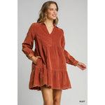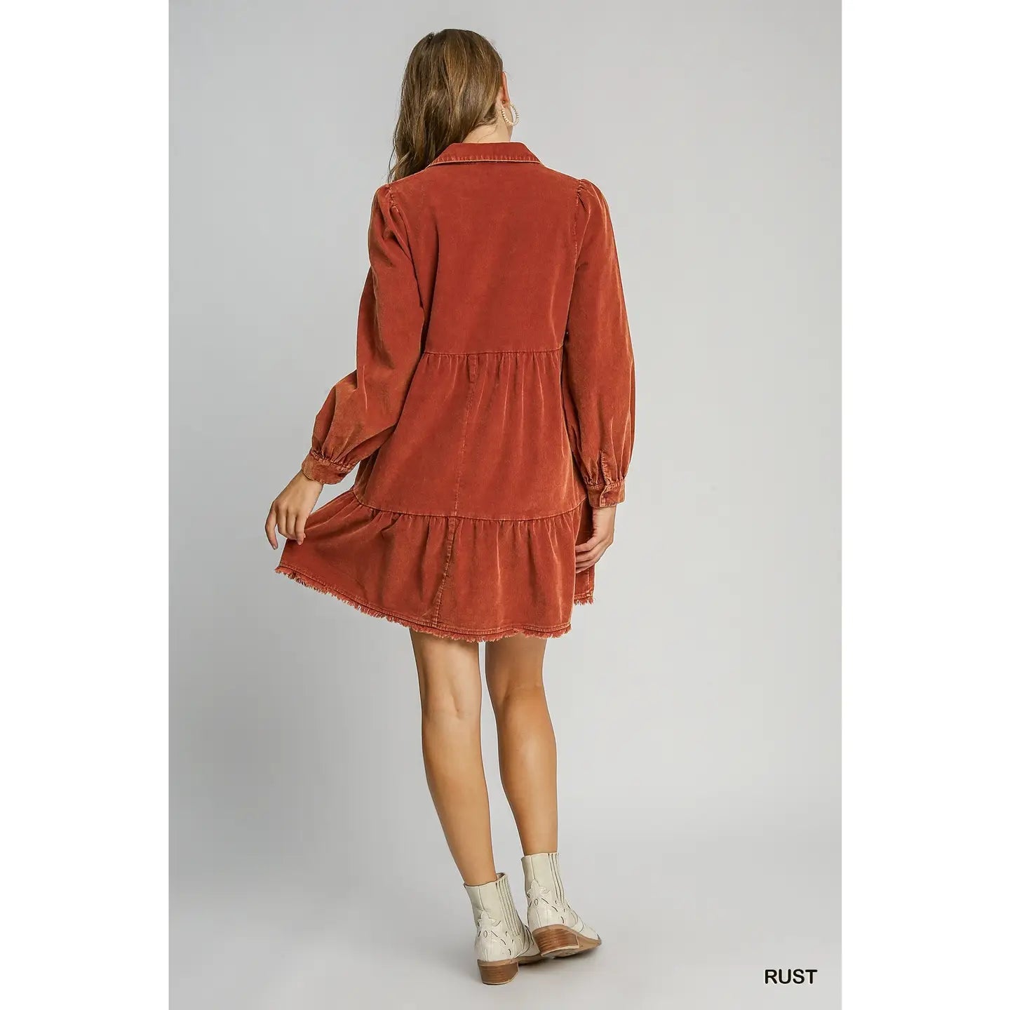 Mineral Washed Corduroy Tiered Dress Rust Color