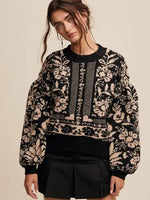 Vintage flower pattern crew neck knit sweater black